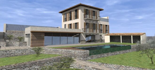 Pensé dans une démarche de réhabilitation élégante du bâti existant, accompagné d’extensions discrètes et harmonieuses, le projet s’inscrit dans le paysage avec une finesse remarquable, sans jamais altérer la vue ni l’équilibre architectural du site.